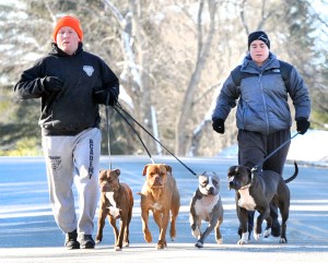 Jay Jack and his wife, Amanda Buckner, of Poland, take their pit bull rescue dogs for their morning run down Hackett Mills Road on Friday morning. Nearly every day they run with the dogs, then take them home for training before going to work. They own The Academy, a Portland gym where they take the dogs for the day.