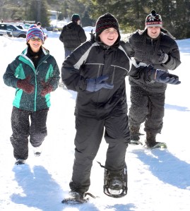 Brandon Wall, front, and Ben Dionne, right, compete in a practice race at Lost Valley Ski Area on Friday morning. At left, is their teacher, Bre Gallagher, from Margaret Murphy Center for Children. Special Olympics competition is so big now, that each year some groups have to take turns sitting out. Instead of going to Sugarloaf for this year’s Winter Special Olympics, some Special Olympians have their own competitions locally, with one in February at Pettengill Park in Auburn.