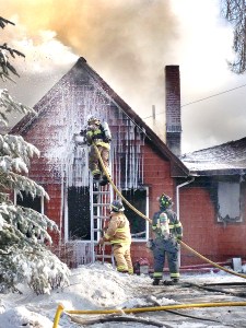 One crew worked to battle fire in an addition behind the house while another worked on the attic fire in front.