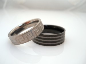 Think outside the ring box. The days of matching bands has given way to couples stylizing their rings. While many brides continue to choose precious metals with diamonds, many grooms select affordable rings of durable metals detailed with pattern, texture and color.