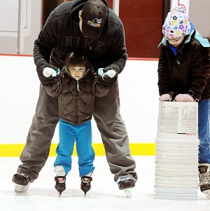 Joe Potvin of Lewiston teaches his daughters, Valerie, 3, and Keira, 8, to ice skate during public skating at Ingersoll Arena on the final day of Auburn’s Winter Festival. “This is her first time, and she’s not impressed,” Potvin said of Valerie.
