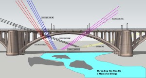 The group’s overall project is to build seven world-class zip lines totalling 14,000 feet that would launch riders from cement platforms and launch towers high along the river. They would pass under Memorial Bridge to the current snow dump site. The pad at that site is tentatively named the Cataract Station.
