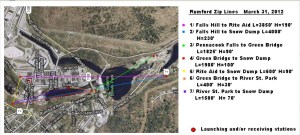 Getting permitting approval and equipment to suspend three 1,300-foot-long zip lines from a foot-trail by Rumford Public Library to the town snow dump on Rumford Avenue is taking much longer. Those three lines will cross under Memorial Bridge and travel over the Androscoggin River to a cement landing pad at the snow dump site.