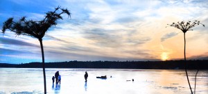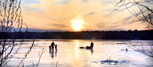 Graeme Mertens, 2, of Hollis, holds on to his father Jared’s hand, with his sister Megyn, 4, as they check their ice-fishing traps on Middle Range Pond in Poland late Tuesday afternoon with their friend, Ron Davis of South Portland.