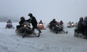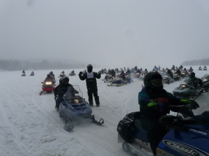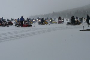 At 1 p.m., riders motored across town to the starting point. Local resident Jack McNulty waved the dozens of snowmobilers gathered at the edge of Rangeley Lake onto the trail to Bald Mountain Camps.