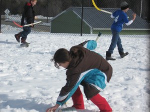 Adams, of Dixfield, watched his fourth-grade son, Noah, and his classmates use hockey sticks to bat white whiffle balls into plastic or tin containers. The temperature was so warm many children removed their jackets when playing.