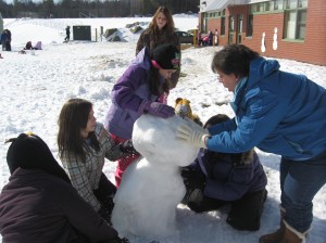 Fourth-grade boys and girls built snowmen with the help of special education technician Andrea Angotti. The girls named theirs “Bill.” The boys said theirs was “No Idea Snowman.”