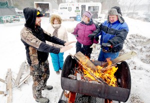 “This is what the non-fishermen do,” said Rhonda Allen, second from right, of Auburn while keeping warm during the third annual Taylor Pond Fishing Derby in Auburn on Sunday. Joe Footer, left, of Auburn, Cindy MacDonald of Leeds, Allen and her dad, Gard Leavitt of Auburn, braved Sunday’s high winds to help raise money for Healthy Smiles for ME. Dental hygienist Cindy Leavitt and her family hold the derby from their backyard to benefit “kids from working families that fall through the cracks.” Healthy Smiles for ME has helped more than 200 children who need dental care but do not qualify for MaineCare or have dental insurance. The derby went off following two earlier attempts that were canceled due to weather. “Third time is a charm,” Leavitt said.