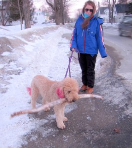 Katie McLaughlin and her dog Bella, 8, carrying a big stick, enjoy a walk Monday in Farmington. Bella’s pink ears and tail are the result of coloring last summer when she participated in a breast cancer walk, McLaughlin said.