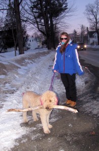 Katie McLaughlin and her dog Bella, 8, carrying a big stick, enjoy a walk Monday afternoon in Farmington. Bella’s pink ears and tail are the result of coloring last summer when she participated in a breast cancer walk, McLaughlin said.