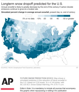 — And an upcoming study in the Journal of Climate says computer models predict annual global snowfall to shrink by more than a foot in the next 50 years. The study’s author said most people live in parts of the United States that are likely to see annual snowfall drop between 30 and 70 percent by the end of the century.
