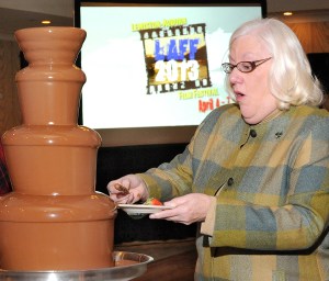 Auburn City Councilor Tizz Crowley reacts as chocolate from the fountain at the Hilton Garden Inn drips off her pretzel and plate during Friday night’s sneak preview of the accepted films for this year’s Lewiston-Auburn Film Festival. There was also a silent auction, and the debut of the “LAFF Get It Started” music video featuring festival staff and members of the Lewiston-Auburn community. The festival will be held April 4 to 7 at various locations in the Twin Cities. For more information and tickets, visit the festival site at lafilmfestival.org.