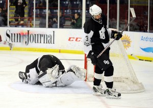 St. Dom’s netminder Grant Carrier came out of the net, trying to beat Sanderson to the puck. Sanderson tipped it away from him, leaving him with an open net.