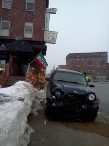 Libby’s blue 2006 Jeep continued down Main Street, hitting a tree near the Lisbon Street intersection and carrying it with him. His vehicle finally came to rest after another 200 feet and smashed into a snow bank alongside the parking lot for Pedro O’Hara’s at 134 Main St.