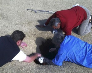 The St. Louis Post-Dispatch (http://bit.ly/13QvcoX ) reports that the mortgage broker from Creve Coeur, Mo., is recovering after a sinkhole opened up beneath him Friday on the fairway at the 14th hole of a southwestern Illinois golf course.