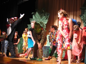 Spruce Mountain Middle School students perform “Seussical Jr.” on Wednesday night in the cafeteria in Jay. The play uses many of the characters made famous by Dr. Seuss, such as the Grinch, the Cat in the Hat, and Horton the Elephant. Some in the 35-member cast and crew kick off the performance with William Thornton, far left, leading as the Cat in the Hat. The musical will be presented again at 7 p.m. Thursday.