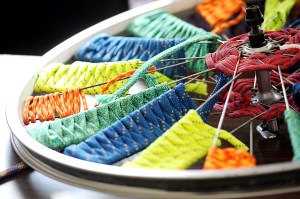 They cut the donated nylon climbing rope into usable lengths and pull out the white centers leaving the colorful outsides. Those are flattened against the sides of a table or chair and wrapped around the spokes of the donated bike wheels to form patterns, whirls of color and propeller blades.