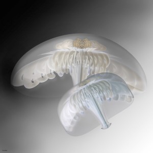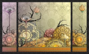 These incredibly intricate, limited-edition prints draw you into their detailed interpretations of Dew’s imagination. “The Secret Garden” is a complex triptych of muted gold, purple and orange that looks like Alice’s walk through Wonderland. “Medusae” appears as an elegant jellyfish floating gracefully through the air. The jewel tones of ”