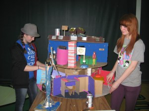 Spruce Mountain Middle School eighth-graders Kylee Jackson and Summer Vigue show their project at Wednesday night’s school science fair in Jay. They were members of the “We Are Going to Mars” team, which earned first place in creativity. Other members of the team were Alex Bessey, Liz St. Pierre, Andrew Cantanese and Jessica Judd. The team created hydroponic gardening beds, a windmill, a water filtering system and other devices that would be required if people tried to live on Mars. The theme for all 20 six-member teams was to show what technology would be necessary in order to sustain human life on the planet. Summer said she learned that Mars has only 48 percent gravity and that rocket fuel could be made from carbon dioxide, oxygen and water.