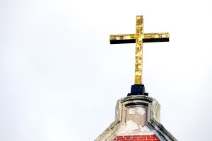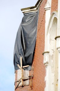 The issues include large cracks down a tower wall that is now supported by braces for safety, cracks in a concrete overhang, a deteriorating stone crown on the roof of the church and loose bricks, which are now covered with rubber to prevent further water and wind damage.