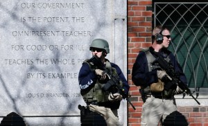 Police were stationed on street corners across downtown Boston, while National Guardsmen set up tents on the Boston Common and stationed tactical vehicles.