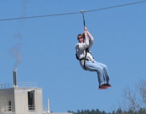 Envision Rumford engineer Jim Sysko of Newry designed and helped install the ride. It was run by professional zip-line operators Monkey C Monkey Do of Wiscasset, Maine’s first high-flying family adventure park with zip lines. One ride cost $10; two rides were $15.