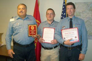Rangeley Fire and Rescue recently presented awards to NorthStar employees. They included, from left, Harold Schaetzle, EMT-1; Steve Grant, driver; and Jeremy O’Neil, paramedic. Schaetzle, NorthStar base supervisor, received an appreciation award from Rangeley Fire Chief Tim Pellerin for NorthStar’s outstanding assistance in the day-to-day operations of the Rangeley Fire Department. Grant received the 2012 Unit Citation for NorthStar 61 for outstanding assistance with a rescue call 64 miles from the Rangeley base to Caribou Island at Parmachenee Lake. And O’Neil received the 2012 Unit Citation Award while on duty with NorthStar 61, “for exceptional service that merits recognition.” NorthStar is the regional ambulance service for Greater Franklin County. It has four other bases in Carrabassett Valley, Phillips, Farmington and Livermore. NorthStar is a program of Franklin Memorial Hospital.