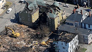 Crews from Gendron and Gendron work on Tuesday to demolish 105-111 Blake Street and 172 Bates Street in Lewiston after Monday’s fire. The two buildings were in danger of imminent collapse, and the building on Pine Street that was destroyed will likely be taken down later this week.