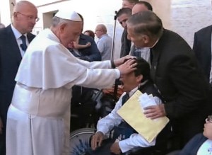Francis laid his hands on the man’s head and recited a prayer. The man heaved deeply a half-dozen times, shook, then slumped in his wheelchair.