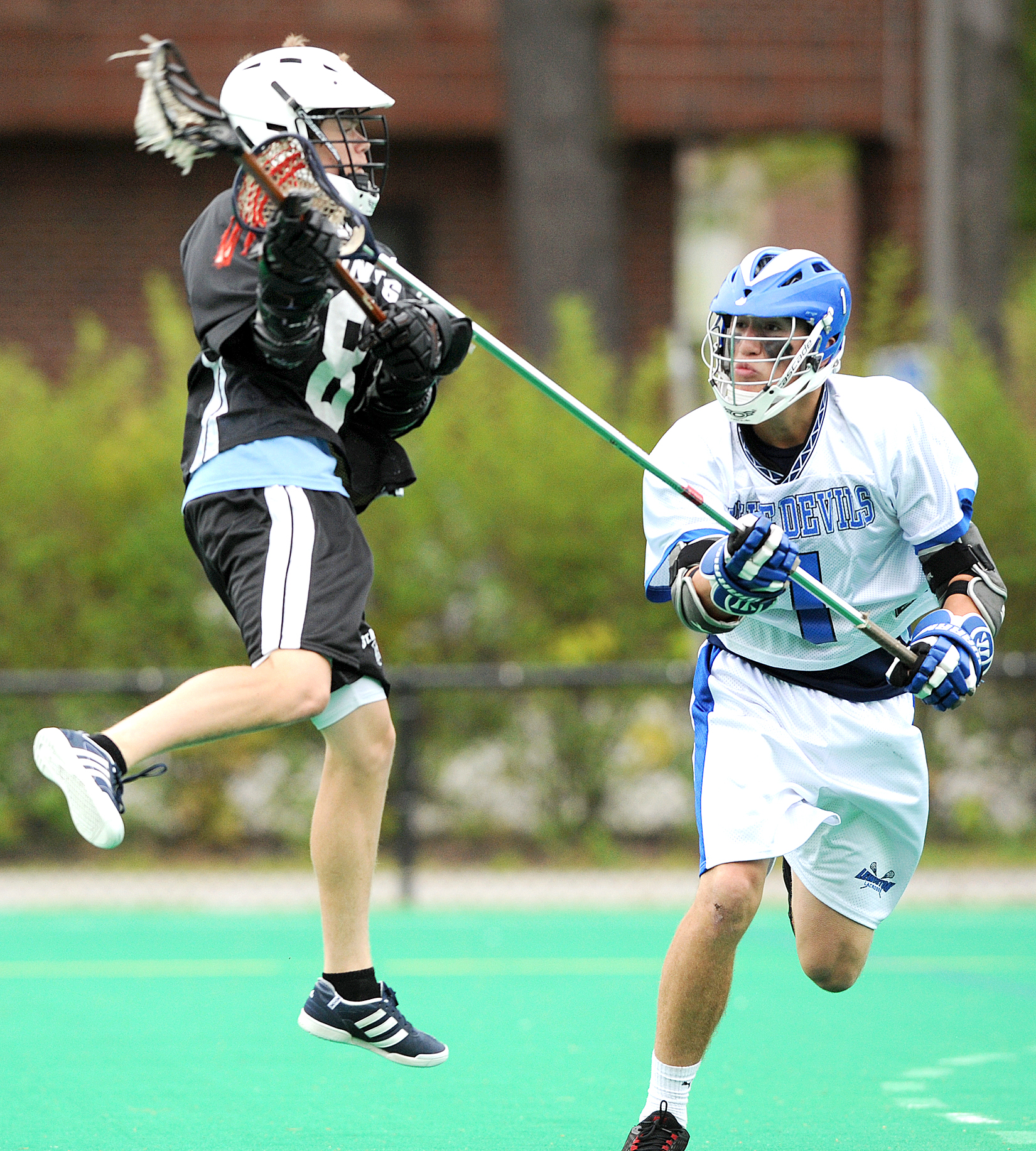 Lewiston’s Griffin Wade, right, checks Dalton Lorenz of Saint Dominic Academy as he releases a shot during Wednesday afternoon’s larcosse game at Bates College in Lewiston.