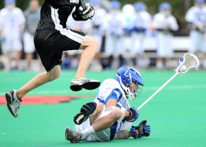 St. Dominic Academy’s Matt Chasse leaps over Lewiston’s Tanner Hubbard after Hubbard lost footing on the wet turf during Wednesday afternoon’s game at Bates College.