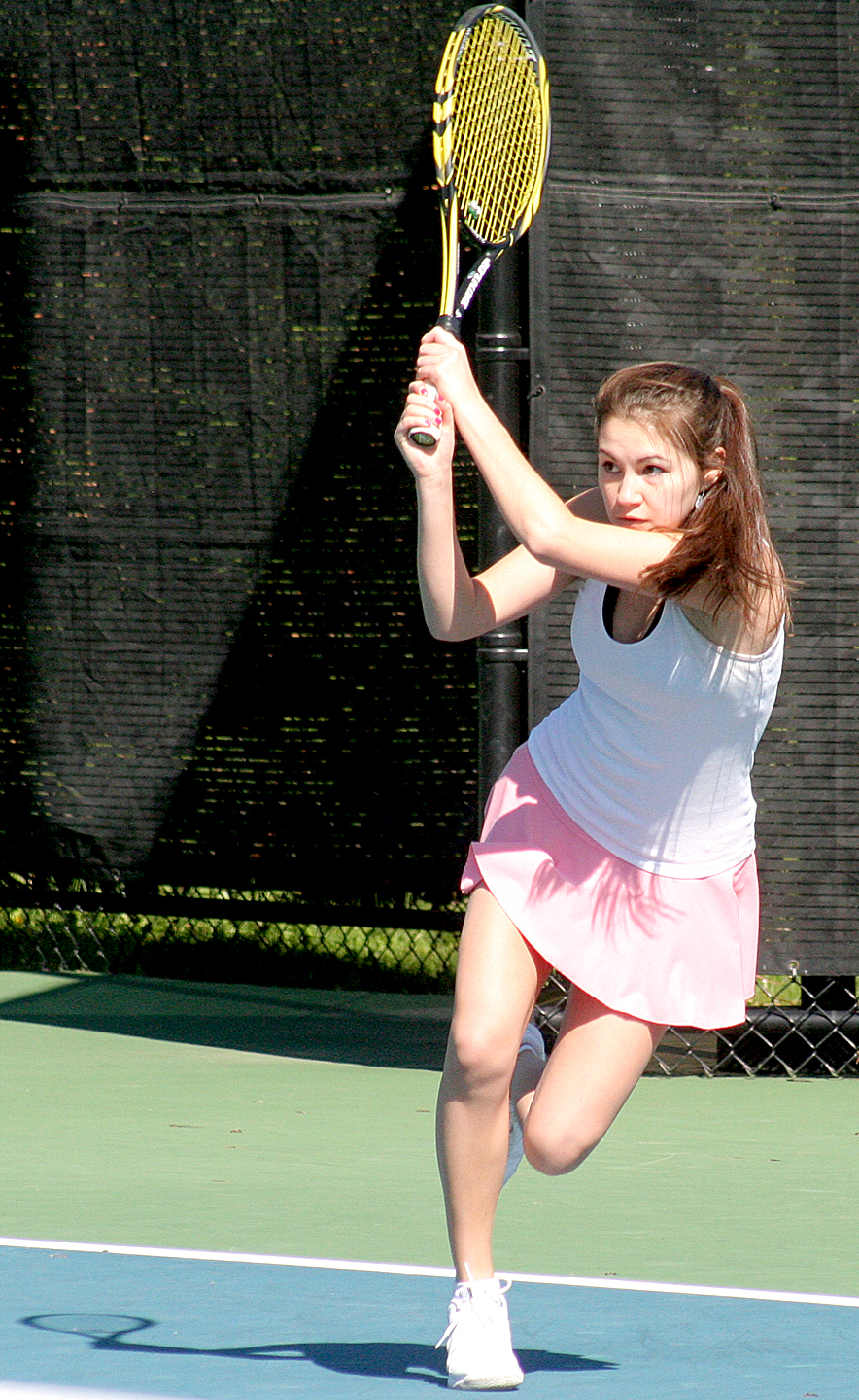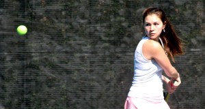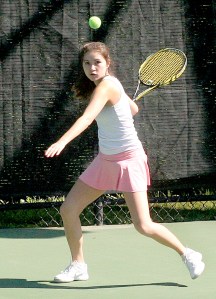 Kaitlyn Thompson of St. Dom’s hits a serve to Julia Brogan of Falmouth during their match Monday in the MPA Singles’ Tournament round of 16 at Bates College in Lewiston.
