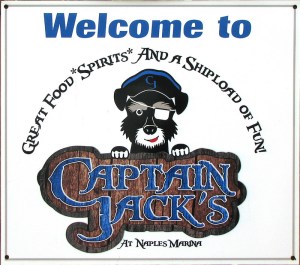 The sign welcoming you to Captain Jack’s at Naples Marina in Naples.