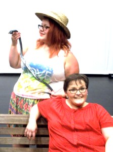 Mother and daughter Laurel and Lisa Fraley, of Farmington, pose at a rehearsal for the upcoming Sandy River Players’ production of “Talking With … “