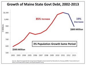 Maine should continue down our new path toward financial security and economic freedom created by attracting business investment and more jobs to our Great State.  To that end, during the past two years, the dramatic growth of government spending has been halted and taxes have been lowered.  Changes to our health insurance laws are beginning to drive down the cost of monthly premiums.  Utility companies are starting to build natural gas pipelines that could lower monthly heating bills by 40%.  Unnecessary and costly regulations have been repealed.  For the first time, public charter schools are providing Maine students and their parents more educational choices.  The graph below shows our shrinking public debt (and interest payments) over the past two years.
