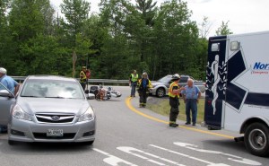 WILTON — The driver of a motorcycle was injured and transported to Franklin Memorial Hospital on Thursday afternoon after a collision with a vehicle at the top of Burgess Hill — the intersection of Routes 2 and 4.