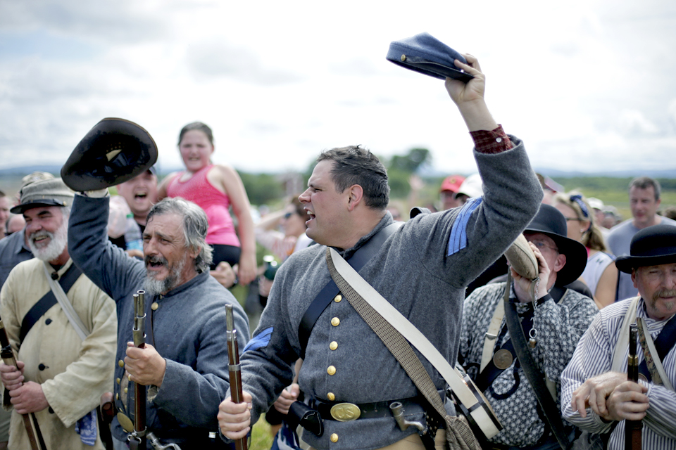 Just like in 1863, the Confederate lines drew out of the woods — but followed this time by tourists snapping pictures and recording their march. News photographers followed along, too, and at times groups broke out into Rebel Yells in an event turned festive at times.