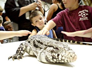 Braden McKenzie-McQuelan, 4, and Skyler McKenzie, 7, pet Susie, the giant tegu lizard, Wednesday at the Lewiston Memorial Armory. The lizard was part of the menagerie brought by handler Nicole Monkiewicz of New Hampshire’s Granite State Zoo W.I.L.D. Center X-7 Animal Encounters. The presentation was for the Twin Cities’ Wednesdays in the Park program.