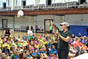 Nicole Monkiewicz of New Hampshire’s Granite State Zoo W.I.L.D. Center X-7 Animal Encounters shows Templeton the caiman to a crowd of children and day campers Wednesday at the Lewiston Memorial Armory. It was part of the Twin Cities’ Wednesdays in the Park program.
