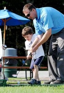 Mark Turner of Lewiston gives his son, Will, 3, his first golf lesson at Taber’s in Auburn on Wednesday. “He wanted to play with daddy, so he got golf clubs from his grandparents for his birthday,” said his mother, Tracy Turner, as she watched with the couple’s twin 1-year old daughters, Jackson and Paislee. Will’s birthday was Saturday.