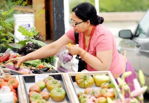 Dalia Karim of Lewiston shops for fresh vegetables from Plainview Farm during the Lewiston Farmers Market on Sunday. Vendors report good weather and a good turnout for this year’s market. The market has averaged 400 people coming to shop each Sunday, said Carol Segal of Mount Apatite Farm in Auburn.
