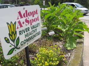This Adopt-A-Spot planter in downtown Rumford is sponsored by the River Valley Healthy Communities Coalition. Among the edibles are pansies (great to top off a green salad), beans, summer squash, eggplants, herbs and much more. Anyone is welcome to help themselves to the produce.