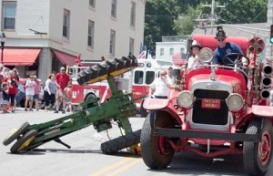 The 83-year-old water pumper, driven by off-duty Bangor firefighter Patrick Heathcote, 29, of Levant, failed to stop on Water Street after the parade route was diverted because of a standoff on Park Street about four blocks away.
