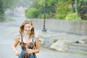 Tabitha Douglas, 14, of Auburn runs through the rain at Festival Plaza in Auburn on Sunday. A brief but heavy rain storm interrupted a day of sun and Douglas’ canoe trip on the Androscoggin River with her father, Neil, and friends. Douglas will be a freshman at Edward Little High School this fall.