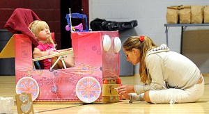 Whitney Perkins, 8, lets her wild hair down with her parents, Kevin and Mary Perkins, of Lewiston, at the Pat’s Pizza Box Car Drive-In on Friday at the Hasty Community Center in Auburn’s Pettengill Park. Last year, Perkins created a pink Hannah Montana car. She decided to go with a hot rod roadster this year.