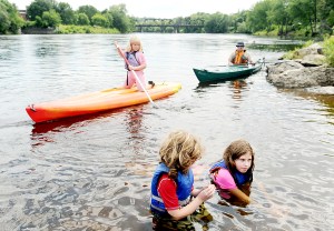 Emma Weber, 11, right, and her brother Noah, 9, swim in the Androscoggin River while Aurelia DuShane, 8, launches a paddleboard at Festival Plaza in Auburn on Wednesday. The Androscoggin Land Trust and Lewiston Auburn Canoe and Kayak Rental will be working together to offer float trips on the river during the Great Falls Balloon Festival from Aug. 16 to 18. LA Canoe and Kayak will also offer guided raft trips down river between launches. The Weber family is visiting from Washington, D.C., and rented kayaks from LA Canoe and Kayak. “We love visiting the lakes and rivers of Maine,” Julie Weber said.
