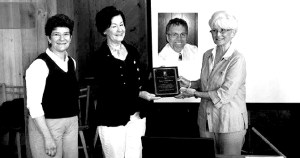 Roger Whitehouse, owner of Riverside Realty, was awarded Realtor of the Year 2013 at a ceremony held June 5, at Saddleback Mountain in Rangeley. From left, accepting the plaque for Whitehouse from Caryn Dreyfus, president of the Mountain Council of Realtors, are brokers Rachel Auger and Louise Horne, both of Riverside Realty.