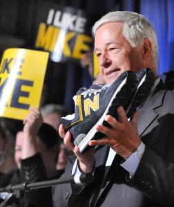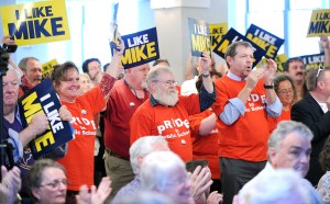 At his entrance and interjected throughout a speech that lasted for more than 30 minutes, the crowd chanted, “We like Mike.” That was clearly going to become a campaign slogan as signs and new campaign buttons replicated the motto.