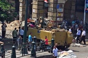 “This state and this people are now under attack,” said Mostafa Hegazy, an adviser to interim President Adly Mansour. Hegazy said the state would defeat the “terrorists” and would soon implement the political road map laid out by Egypt’s military after it wrested control from Morsi last month.