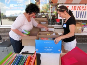 Christine Tropeano, left, and Keli McLellan, volunteers for United Way of the Tri-Valley Area, organize items to fill school backpacks Friday afternoon outside BigLots! on routes 2 and 4 in Farmington. Volunteers from BigLots!, the United Way, the Farmington Rotary Club and the community filled more than 150 backpacks with donated items.